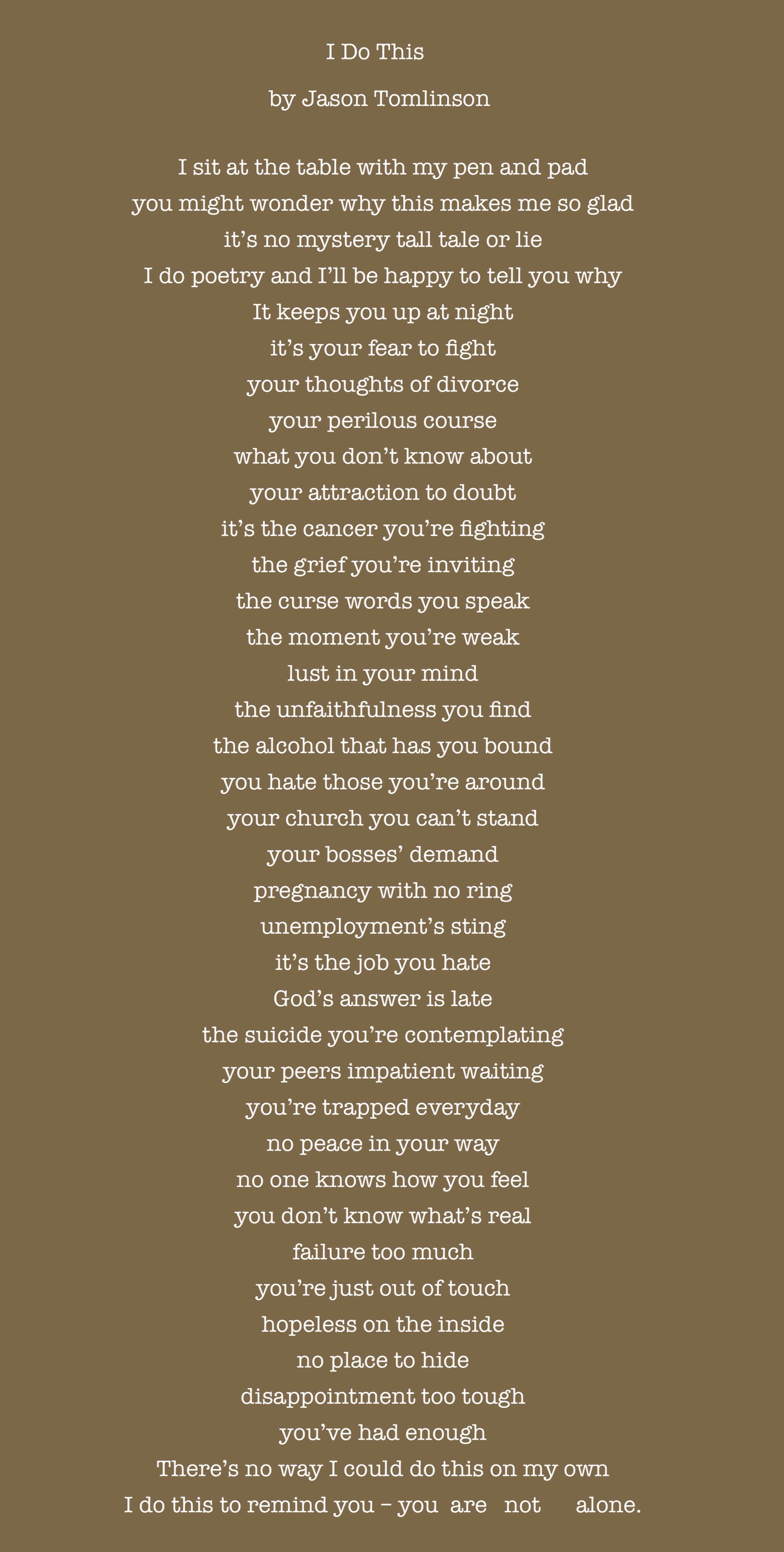 Hope I Do This Date: January 25, 2015Author: Jason Tomlinson 0 Comments This one is about ten years old but something my pastor said this morning brought it to mind. Share this: Click to email a link to a friend (Opens in new window) Email Click to share on Facebook (Opens in new window) Facebook Click to share on X (Opens in new window) X Click to share on Pinterest (Opens in new window) Pinterest Click to share on Tumblr (Opens in new window) Tumblr Like Loading... Related
