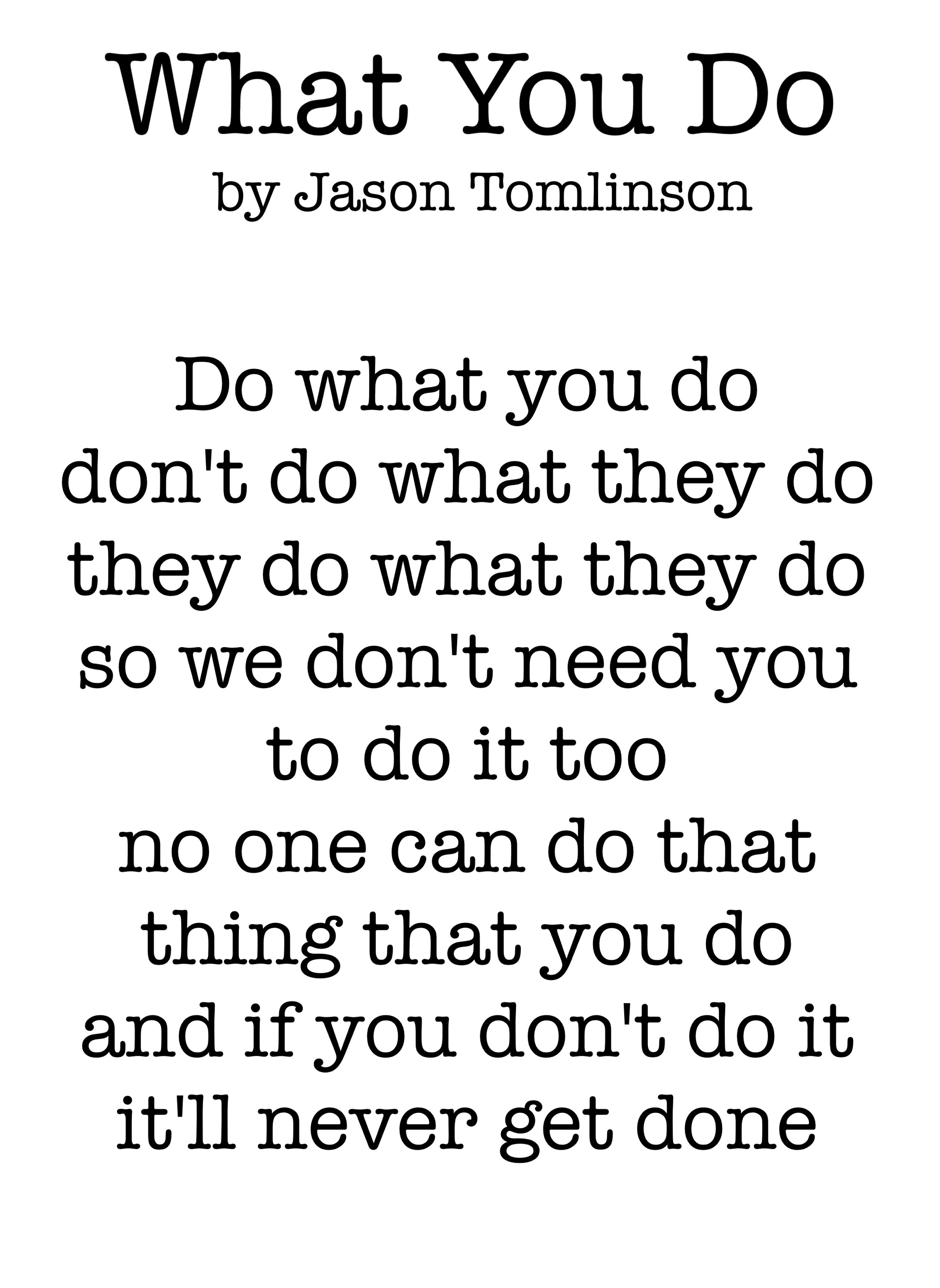 inspirational 307. What You Do Date: October 6, 2015Author: Jason Tomlinson 0 Comments What You Do by Jason Tomlinson Do what you do don’t do what they do they do what they do so we don’t need you to do it too no one can do that thing that you do and if you don’t do it it’ll never get done Share this: Click to email a link to a friend (Opens in new window) Email Click to share on Facebook (Opens in new window) Facebook Click to share on X (Opens in new window) X Click to share on Pinterest (Opens in new window) Pinterest Click to share on Tumblr (Opens in new window) Tumblr Like Loading... Related