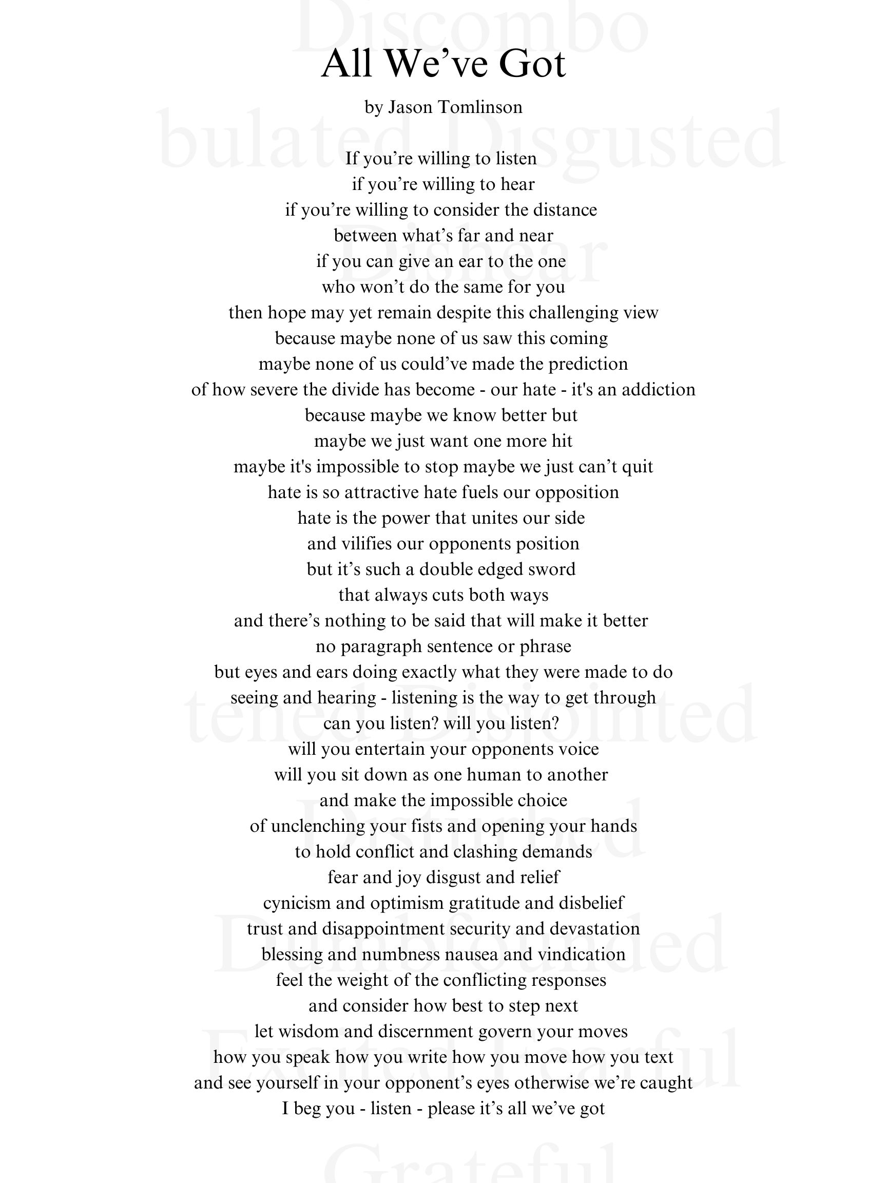 If you’re willing to listen if you’re willing to hear if you’re willing to consider the distance between what’s far and near if you can give an ear to the one who won’t do the same for you then hope may yet remain despite this challenging view because maybe none of us saw this coming maybe none of us could’ve made the prediction of how severe the divide has become - our hate - it's an addiction because maybe we know better but maybe we just want one more hit maybe it's impossible to stop maybe we just can’t quit hate is so attractive hate fuels our opposition hate is the power that unites our side and vilifies our opponents position but it’s such a double edged sword that always cuts both ways and there’s nothing to be said that will make it better no paragraph sentence or phrase but eyes and ears doing exactly what they were made to do seeing and hearing - listening is the way to get through can you listen? will you listen? will you entertain your opponents voice will you sit down as one human to another and make the impossible choice of unclenching your fists and opening your hands to hold conflict and clashing demands fear and joy disgust and relief cynicism and optimism gratitude and disbelief trust and disappointment security and devastation blessing and numbness nausea and vindication feel the weight of the conflicting responses and consider how best to step next let wisdom and discernment govern your moves how you speak how you write how you move how you text and see yourself in your opponent’s eyes otherwise we’re caught I beg you - listen - please it’s all we’ve got